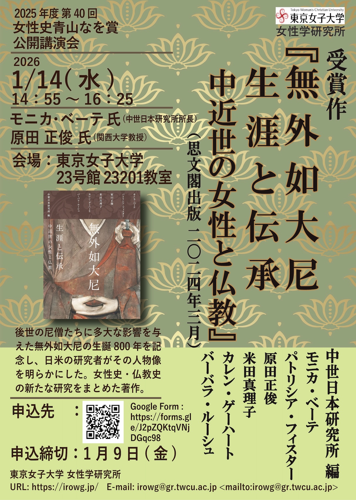 【本学学生・教職員・一般対象】2025年度 第40回「女性史 青山なを賞」受賞作 公開講演会のお知らせ(2026/1/14(水)対面・オンライン同時開催)