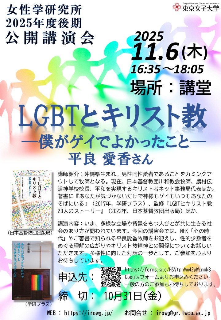 概要:いま、多様な立場や背景をもつ人びとが共に生きる社会のあり方が問われています。今回の講演会では、NHK「こころの時代」やご著書で知られる平良愛香牧師をお迎えし、性的少数者をめぐる理解の広がりやキリスト教精神との関係についてお話しいただきます。多様性に向けた対話の一歩として、ご参加を心よりお待ちしています。