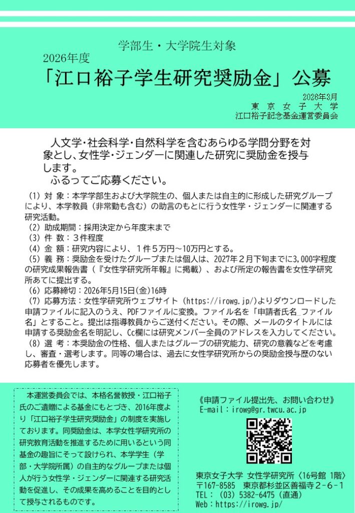 2026年度「江口裕子学生研究奨励金」公募(2026年5月15日(金)16時締切)