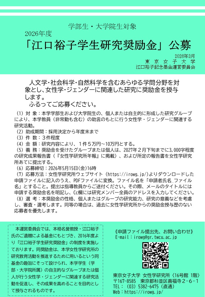 女性学研究所では、本学名誉教授・江口裕子氏の御遺贈による基金にもとづき、2016年度より「江口裕子学生研究奨励金」の制度を実施しております。